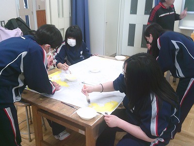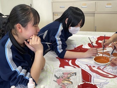 学級旗を作成し、クラスの団結力を高めます。みんなで協力して、作成しています。完成した作品は体育祭で披露します。