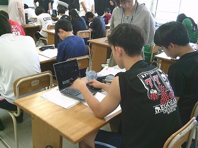 はばたき学習クラブ長期休業版を実施しています。今回の参加人数は約50名です。エリアの小学校の先生や畜大生にサポートをお願いしています。スポットクーラーの2台、扇風機6台を使い、暑さ対策をしています。