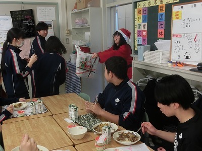 給食時間に、サンタさんがプレゼントをもってやってきました。