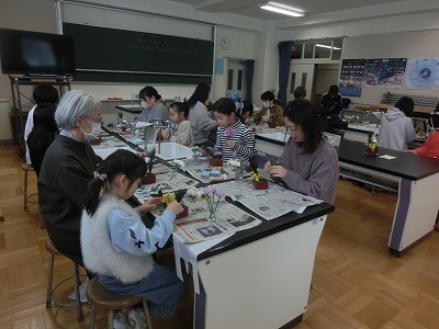 外部の専門家を招き、お花教室、実験教室(牛の子宮の解剖・マイ箸作り)を実施しました。エリアの小学生も参加し、交流を深めました。