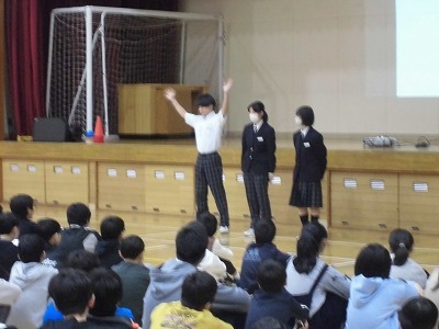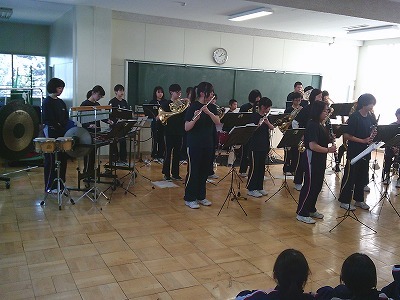 今回は、2学年を対象にコンサートを行いました。昼休みの短い時間でしたが、写真からも分かるように、多くの人が来場し、演奏を楽しんでいました。