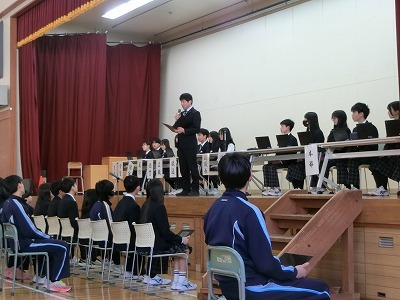 来年度の学校の中心を担うメンバーが出揃い認証されました。活躍を期待しています。生徒総会では、後期の活動について総括し、各委員会へ意見や要望が出されるなど、次年度の活動へ向けてのよい引き継ぎの場となりました。
