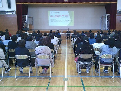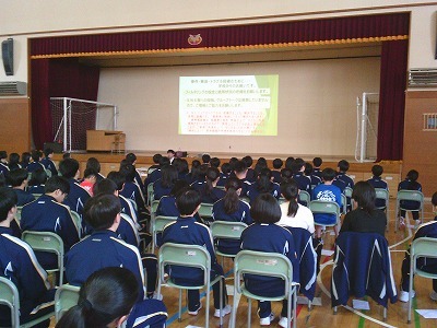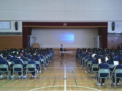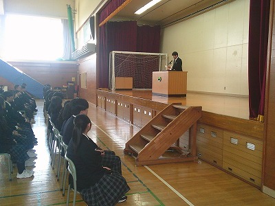 3年生は受験を終えましたが、特別授業が行われています。本日は、学校長による講話と消費者講座(お金の話)でした。校長先生は、勝負服(写真中央)で生き方についてお話くださいました。