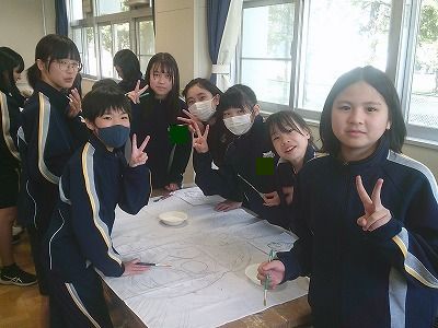 学級旗を作成し、クラスの団結力を高めます。みんなで協力して、作成しています。完成した作品は体育祭で披露します。