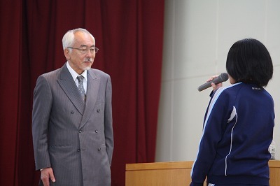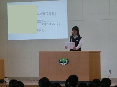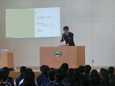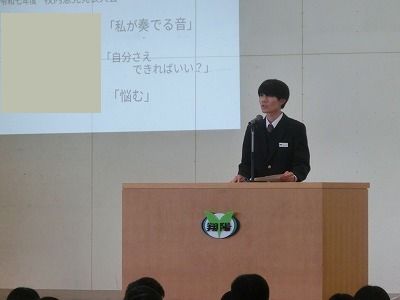 各学年の代表者が堂々と発表しました。発表テーマは1年生代表「私の奏でる音」、2年生代表「自分さえできればいい?」、3年生代表「悩む」でした。本日の結果は、明日の文化祭の閉会式で発表されます。