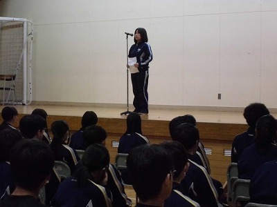 今回のいじめ撲滅集会では、「相談すること」について考えました。困ったことがあったときに、誰かに相談してみることが大切であることを動画で学びました。集会の最後には生徒会長から、「嫌な思いをしている人がいるということを私たちはどう受け止めるのか」という話がありました。