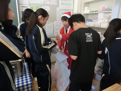 給食時間に、サンタさんがプレゼントをもってやってきました。