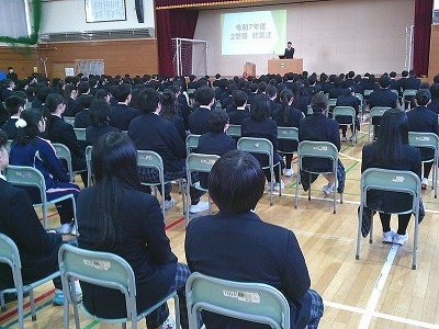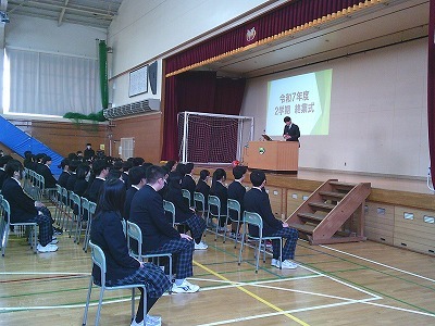 終業式を行い、校長先生からのお話と生徒代表の挨拶がありました。長かった2学期も終え、冬休みを迎えます。明日から、冬休みに入ります。3年生は受験に向けてラストスパートです。充実した冬休みをお過ごしください。