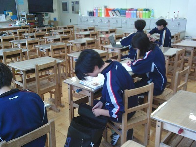冬休み初日から約40名が集まり、学習会を行っています。小学校の先生にもサポートしていただいながら、冬休みの宿題や受験勉強に励んでいます。隣の部屋では陸上部の生徒も勉強を行っています。