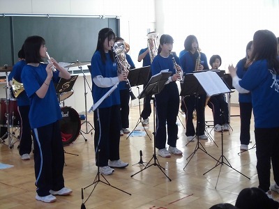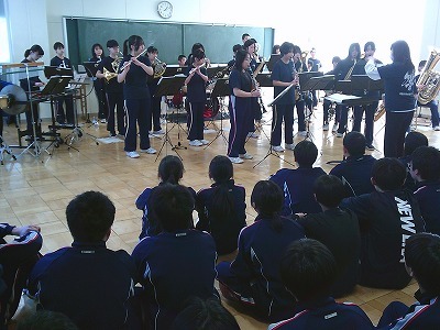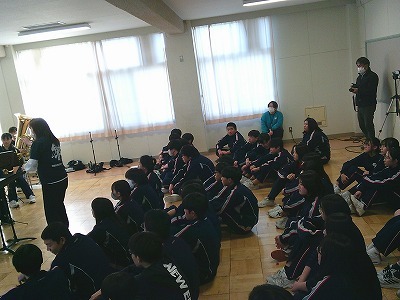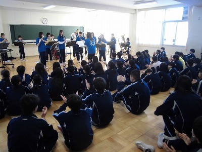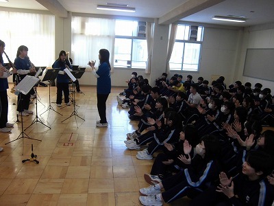 今回は、2学年を対象にコンサートを行いました。昼休みの短い時間でしたが、写真からも分かるように、多くの人が来場し、演奏を楽しんでいました。